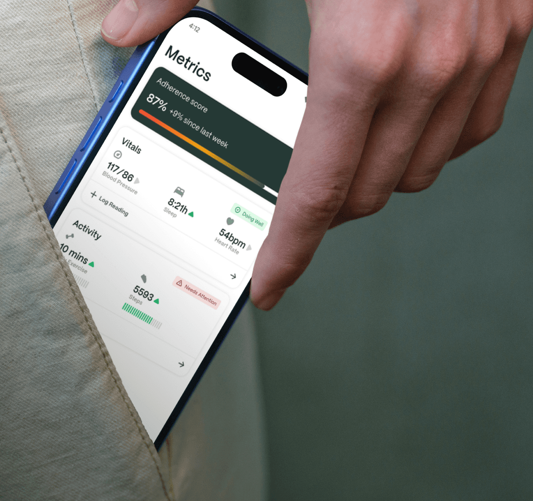Tracks heart rate, BP, sleep, and more—automatically updating care plans.